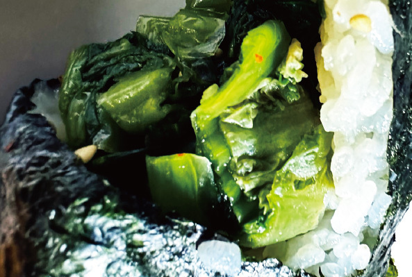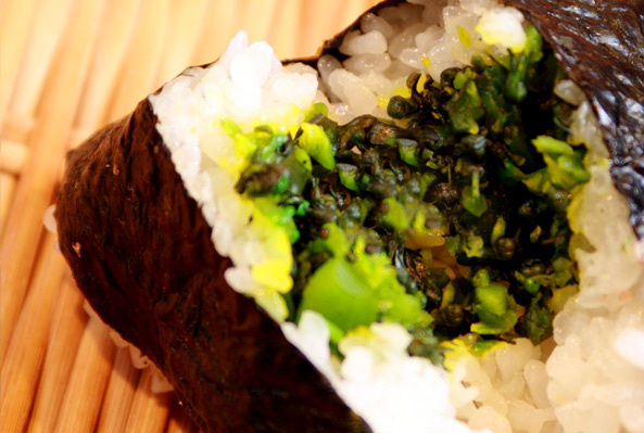 青高菜の豊かな風味と味がお口いっぱいに広がるかにや自慢のおにぎりです。